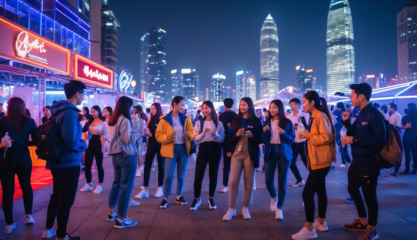 Sekelompok orang muda menikmati pesta malam di kota besar Indonesia dengan latar gedung pencakar langit dan lampu warna-warni, suasana ramai dan aman.